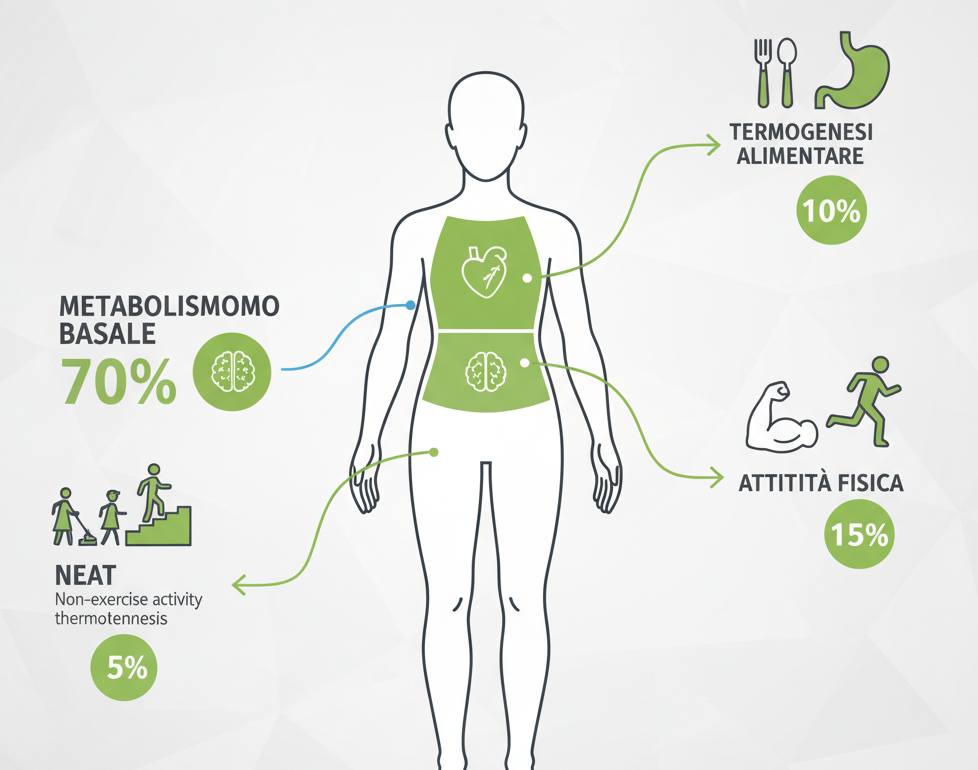 Energia OUT: metabolismo basale (60-75%) + termogenesi alimentare (8-15%) + attività fisica (15-30%) + NEAT (termogenesi non da esercizio)